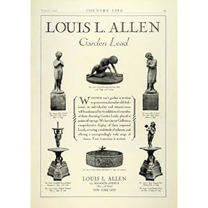This is an original 1929 black and white print ad for Garden Lead figurines, statues, sun dials, bird baths and other garden decor by Louis L. Allen, located at 521 Madison Avenue in New York.